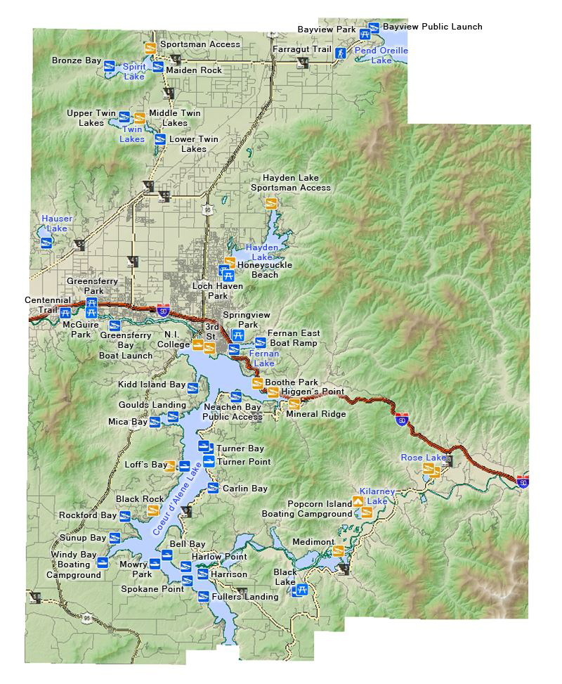 Bayview Launch Bayview Park Bell Bay Black Lake Black Rock Boothes Park Bronze Bay Carlin Bay Centennial Trail Farragut Trail Fernan East Fernan Park Fuller's Landing Goulds Landing Greensferry Launch Greensferry Park Harlow Point Harrison Docks Hauser Park Honeysuckle Beach Kidd Island Bay George Anderl Memorial Park Loff's Bay Launch Loff's Bay Launch Maiden Rock McGuire Park Medimont Higgen's Point Mineral Ridge Mica Bay Launch Mowry Park Neachen Bay North Idaho College Popcorn Island Rockford Bay Rose Lake Spirit Lake Sportsman Access Spokane Point Hayden Lake Sportsman Access Springview Park Sunup Bay Third St. Breakwater Turner Bay Turner Point Lower Twin Lake Middle Twin Lake Upper Twin Lakes Windy Bay